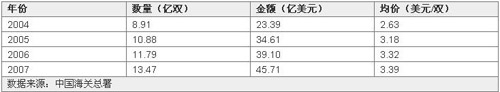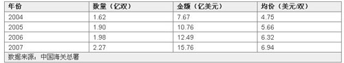 據我國海關統計,2007年,中國對美國鞋類出口總量為19.85億雙,同比下降0.69%;出口總額為81.39億美元,同比增長了8.11%;平均單價為4.10美元/雙,同比增長了8.86%。表2-6為2004年至2007年中國鞋產品出口美國主要統計數據: