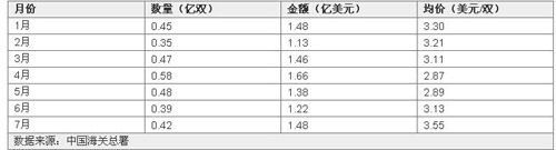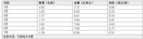 自從去年3月美國“次級貸”危機爆發以來,美國消費指數一度下滑,受此影響,2007年中國鞋類產品對美國出口數量下降,同時,受國家出口退稅下調和人民幣持續升值的影響,鞋類出口企業利潤被壓縮,2008年上半年,對美國出口數量為10.51億雙,同比下降5.40%;出口金額為43.54億美元,同比增長6.76%;單價4.14美元/雙,同比增長12.86%。圖2-3和2-4為2008年1至7月中國鞋類產品出口美國市場出口數量、出口金額和出口均價變化趨勢