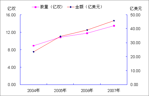 近年來俄羅斯鞋類產品進口數量和金額保持穩定增長。據俄羅斯統計局統計,2006年俄羅斯鞋類產品進口金額達到11.7億美元,比1999年增長了1883%。其中成品鞋進口了1.1億雙,進口金額達11.2億美元,分別比2004年增長了57.9%和106.0%。