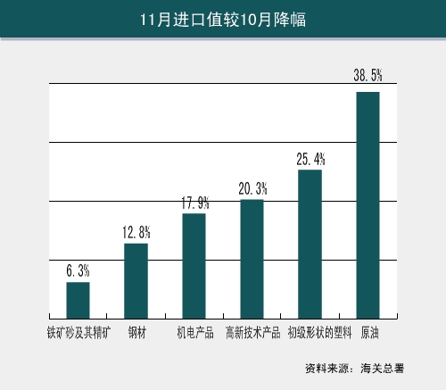 進口空前下滑,一方面是由于近期國際大宗商品價格大幅下降,另一方面是受國內需求低迷影響。在進口商品絕對數量中,初級產品進口步伐明顯加快,前11個月,中國進口原油1.645億噸,增長9.5%;進口成品油3522萬噸,增長13.1%;進口大豆3414萬噸,增長22.4%。原油、成品油和大豆進口量的增長分別比今年上半年下降了1.5個百分點、3.3個百分點和2個百分點,而受原材料價格下跌的影響, 1月至11月這三類產品進口值的增長更比1月至6月的增幅分別慢了12.6個百分點、8.9個百分點和18.1個百分點,進口成本的節約推高了外貿順差。