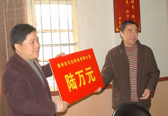 日前,溫州市人大常委副主任翁錦武率市有關扶貧掛鉤單位來到平陽縣鳳巢鄉開展結對扶貧活動,溫州吉爾達鞋業有限公司黨支部書記黃遠輝代表公司將6萬元助學資金捐助給了該鄉較為貧困的大嶺村。
