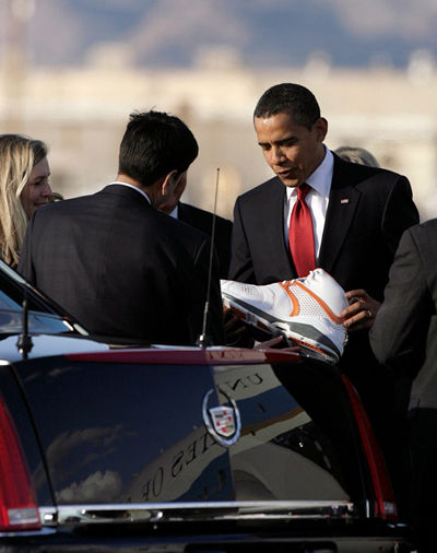 2009年2月17日 ,美國總統(tǒng)奧巴馬空降鳳凰城,與父親一同迎接總統(tǒng)的菲尼克斯市市長兒子別出心裁,把一只太陽隊(duì)奧尼爾的球鞋作為送給這位喜好籃球總統(tǒng)的“大禮”。作為今年全明星賽MVP的NBA巨星奧尼爾,其腳下李寧品牌戰(zhàn)靴已成為全世界籃球迷所追捧的珍藏品。
