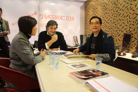 紅蜻蜓總裁錢金波(圖右)在接待國外客戶