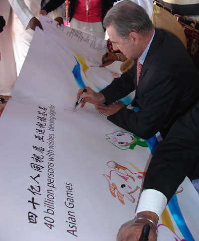 中國(guó)鞋網(wǎng)3月18日訊 2009年3月12日,廣州2010年亞運(yùn)會(huì)高級(jí)合作伙伴361°在科威特Courtyard Hotel成功簽約亞奧理事會(huì)(英文縮寫:OCA),既而成為亞奧理事會(huì)全球官方贊助商。出席此次會(huì)議的有:國(guó)際奧委會(huì)主席羅格、亞奧理事會(huì)主席艾哈邁德•法赫德•薩巴赫親王、亞組委常務(wù)副秘書長(zhǎng)、廣州市副市長(zhǎng)許瑞生以及361°代表等。會(huì)上羅格主席在亞運(yùn)留言橫幅上用中文簽名,表達(dá)了其對(duì)廣州亞運(yùn)會(huì)的支持。