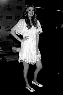 甜美鄰家女孩Mischa Barton大約是最喜歡穿平底鞋的女明星了,于是在搭配上也總有新意。即使是為號稱“冠軍之鞋”的Keds帆布鞋造勢宣傳,她也選擇了這種類似芭蕾鞋款的,搭配白色蕾絲紗裙,青春甜美的味道呼之欲出。與平底鞋相搭配,最適合的自然是A字傘裙,但裙長不宜過長或過短,及膝程度就剛剛好,否則小腿會顯得很粗大。