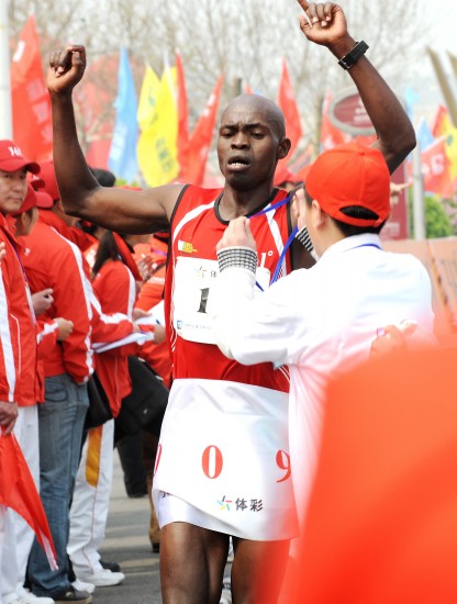 本屆“鄭開國際馬拉松”的舉行適逢我們偉大祖國60周歲生日,為此大賽組委會特意以“祖國萬歲 愛心馬拉松”為主題。1.8萬的參賽人數也創造了歷年之最。賽事中,我們既看到了運動員的颯爽英姿,也看到了萬人向祖國生日獻禮的宏大場面,同時我們共同見證了組委會及各合作伙伴對社會的愛心之舉。2小時17分24秒之后,來自肯尼亞的羅伯特第一個完成了42.195公里的賽程,站在了男子選手的最高領獎臺上,中國選手王碩以6秒之差獲得亞軍。女子冠軍被來自中國的馮愛萍以2小時36分22秒獲得。