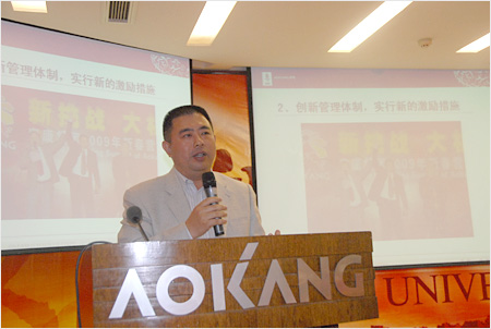 集團(tuán)總裁王振滔正在作“全力推進(jìn)奧康事業(yè)跨 越式發(fā)展”的主題演講