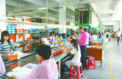 南安市九都鎮一家體育用品有限公司童鞋成型車間一角。