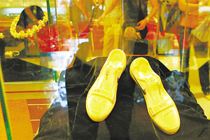 【中國鞋網】2007年,“飛人”劉翔的一雙普通跑鞋就賣了17萬元,那假如這雙鞋是純金打造的呢?昨日,為“翔飛人”量身打造的一雙黃金跑鞋驚現蕭山市心南路的某珠寶店,據了解,這雙鞋現在的市值超過30萬元人民幣。