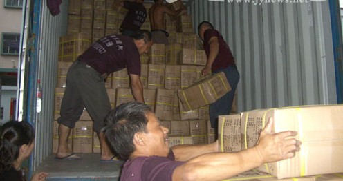 圖為榕城仙橋鞋業區某鞋廠一批輸埃及的鞋類產品正在裝上集裝箱貨柜車。