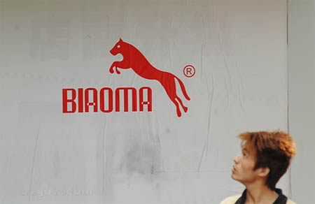 原來,山寨貨的大家族又添新成員。這幅海報遠遠看去就像是著名體育品牌彪馬的廣告LOGO,動物跳躍的圖形、英文字體的相似都讓人誤以為是彪馬的廣告LOGO,走近一看原來是“BIAOMA”而不是“PUMA”。市民小王就告訴記者,這種廣告,咋一看還真挺像的,一不小心就“中招了”,確實很“雷人”。