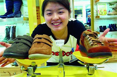 中國鞋網11月06日訊,昨日,在濟南一商場,工作人員展示一款每只只有170克的超輕鞋,兩只超輕僅與一只普通鞋的重量相當。據了解,該款鞋子采用超輕材質制作,穿著更加舒適、方便。