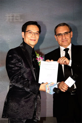 三大品牌首席設計師Jose Sanchis先生將品牌授權代理書交給紅蜻蜓集團董事長錢金波