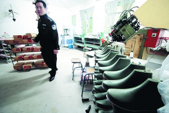 浮橋派出所的盧警官介紹,昨日下午,民警巡查到繁榮路1185號一棟尚未裝修的兩層出租房門口時,看見大鐵門緊閉著,可仔細一聽,里面卻不時傳出機器的轟鳴聲和人員頻繁走動的聲音,民警感到很可疑,敲開門進去一看,沒想到卻是個生產運動鞋的制假窩點。民警當即責令工人停止制假行為,并通知了浮江工商所人員趕到現場一起查處。