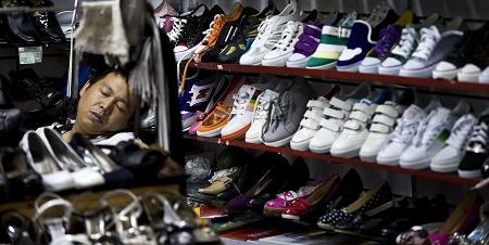 一名鞋店老板在小店鋪里打盹。一旦人民幣被迫快速升值,將對(duì)以鞋企為代表的微利的中國(guó)中小企業(yè)造成毀滅性打擊。 隨之而來的,則是大量人員失業(yè)。