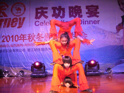 中國鞋網04月13日訊, 2010年4月12日晚,明偉公司為旗下駱駝品牌全國數百名代理商舉行規模宏大的慶功晚宴,通過時尚模特、流行歌手、吳橋雜技、爵士樂、小提琴表演,在美侖美幻的意境中,為所有來賓奉上珍貴的視聽盛宴,歷時三天的駱駝美式少年越野裝備2010年秋冬新品訂貨會在晉江榮譽國際大酒店勝利落下帷幕。