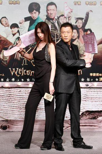 孫紅雷和林志玲手舉道具刀,模仿海報中的搞怪pose