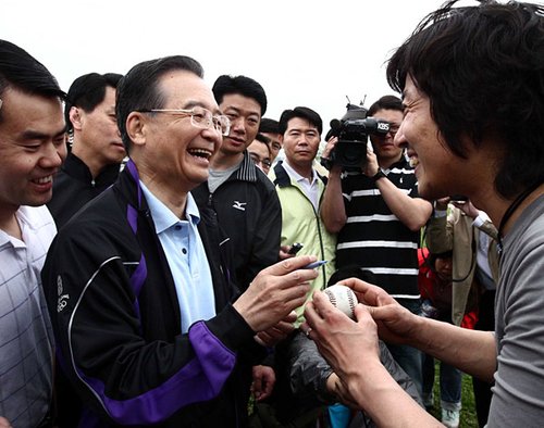 溫家寶與韓國青年一起打棒球后在棒球上簽名留念。