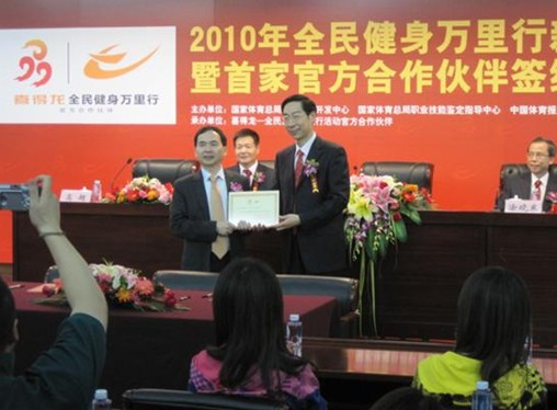 圖為:馮建中副局長授予喜得龍集團2010“全民健身萬里行”官方合作伙伴證書