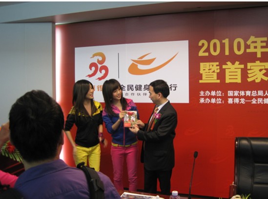 圖為:by2組合參加喜得龍2010“全民健身萬里行”新聞發布會