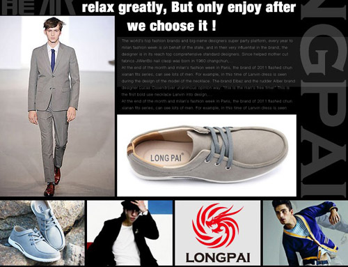 如果您是位走在時尚尖端的男性,絕對不能錯過龍派“動挾王者之風,靜斂隱者之逸” 的品質精髓。龍派商務(中國)有限公司根據市場的需求不斷完善產品,打造大眾、時尚、個性、流行、休閑等多種特色的品牌。運用創新的思維,將傳統與現代巧妙地結合,不僅僅是在產品中融入龍的元素,力圖傳遞出龍的精神,更是要以品牌的力量把中國博大精深的文化淋漓盡致地表現出來。龍派商務休閑(中國)有限公司董事長汪建聰先生在接受《鞋無止境》記者采訪時表示:“只有民族的才是世界的。放眼國際市場,讓全世界的眼光都來關注中國的品牌,是一個人對民族永遠無法割舍的一份情感。我們有責任做一個非常好的品牌,把中國的鞋文化底蘊挖掘出來。把龍派打造成中國出名,世界出名的民族品牌是我們矢志不移的奮斗目標。”