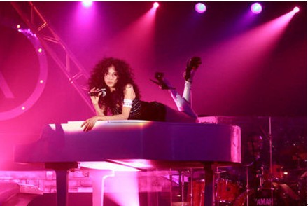 之后莫文蔚唱《陰天》又施性感招數,換上背心短裙邊唱邊跳到鋼琴上,如“小野貓”上身不停轉換姿勢,又睡又爬,動作誘人大膽。