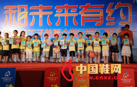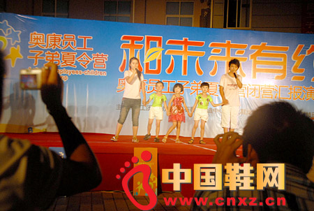 中國鞋網(wǎng)8月23日訊, 為期40天的奧康員工子弟夏令營昨天晚上在奧康總部舉辦了畢業(yè)演出。200多位小營員紛紛登臺,躍躍欲試,在爸爸、媽媽面前一顯身手。