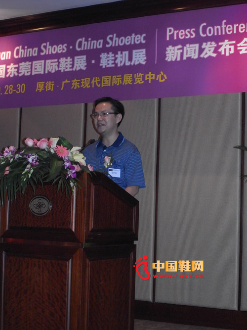 雅式展覽服務(wù)有限公司董事長(zhǎng)朱裕倫先生向記者及嘉賓推薦2010秋季鞋展的新投入和新亮點(diǎn)。
