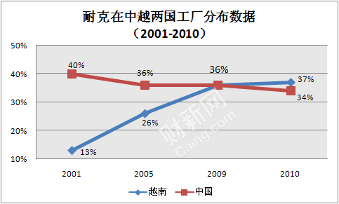耐克的運(yùn)動(dòng)鞋都是外包生產(chǎn)的。歷年年報(bào)顯示,2001年時(shí),中國(guó)生產(chǎn)了其40%的鞋,在各國(guó)排名第一,而越南只占到13%的份額;到了2005年,中國(guó)的份額降至36%,還是排第一,越南升到26%,排第二;在2009年,中國(guó)和越南并列第一,都是36%;到了2010年,越南超過(guò)了中國(guó),占37%,中國(guó)退居第二,占34%。