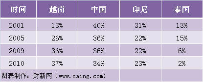 從下表可見(jiàn),過(guò)去10年,印尼的份額雖然下降了,但依然保持相當(dāng)?shù)姆蓊~。到2010年,印尼占23%,前三家一共達(dá)到94%的份額。泰國(guó)和印度等國(guó)占的份額微不足道。