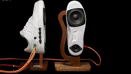 喜歡NIKE球鞋的朋友都知道這雙鞋,經典板鞋空軍一號,它被掛在了架子上,成了一對音箱。這是球鞋設計師Nash Money自己動手制作的一對電腦音箱,將鞋底掏空,把音箱功放,單元等都一并安置在空軍一號中,然后掛在兩個支架上,這個想法實在是酷。