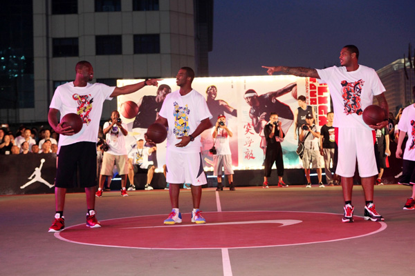 【中國鞋網-品牌動態】Jordan Brand全明星球員克里斯-保羅、德懷恩-維德及卡梅隆-安東尼此次空降中國四大城市,于香港、成都、杭州和北京四個城市掀起‘Jordan Brand 2011飛翔之旅’的狂潮,此次活動是三位巨星首次一同到訪中國,在北京緊張的行程中的,三位巨星與北京的年輕球員進行了豐富多彩的互動和交流,將本次的‘Jordan Brand 2011飛翔之旅’活動推向高潮。