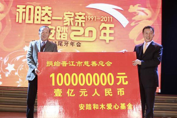 在當晚的尾牙宴上,榮譽董事長丁和木將這筆巨額善款捐給晉江市慈善總會,泉州市政協副主席、晉江市慈善總會會長許連捷接過這筆巨額善款的牌匾,并向其頒發感謝牌匾。