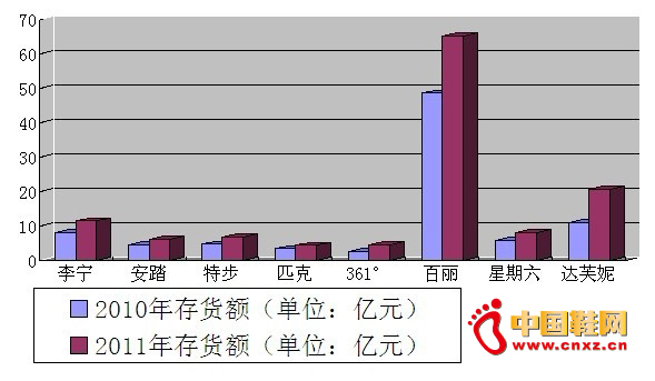 李寧公司的庫存大幅上升,2011年,集團存貨金額為11.33億元,較上年同期的8.06億元同比上升40.57%。安踏集團的存貨額達到6.1億元,同比增長36.21%。 特步公司去年全年銷售收入55.4億元,同比增長24.28%,存貨額也上升45.17%,達到6.7億元。而361度去年銷售收入55.68億元,同比增長14.84%,存貨額增長幅度高達81.80%,達到4.51億元。匹克去年營業收入46.5億元同比增長9.40%,存貨額增長幅度在五大品牌中最低,為25.73%,存貨額4.21億元。