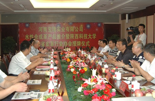 【-鞋材資訊】2012年6月18日,“水性合成革產品推介暨陜西科技大學人造革合成革工程技術研究中心、河南省皮革行業協會常務理事單位”授牌儀式在河南寶隆實業有限公司隆重舉行。同時,寶隆實業的水性合成革生產線也于當日順利投產,目前日產可達3萬米。