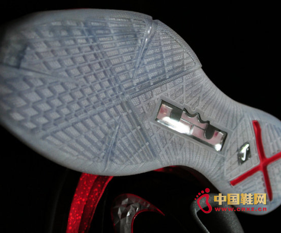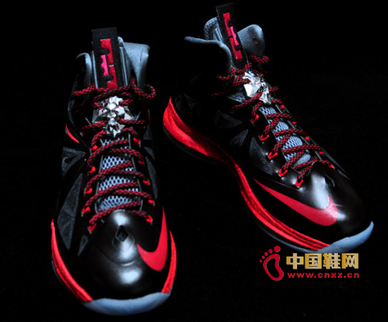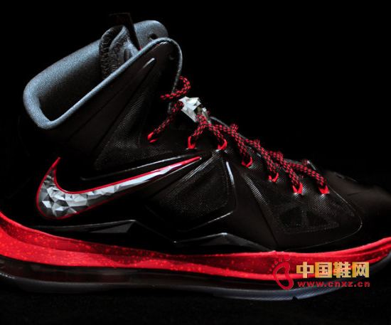 【中國鞋網-時新裝備】這雙邁阿密客場配色的Nike LeBron X+ 綽號就叫做“pressure”~充滿壓力的客場。簡單的黑紅配色,中底噴墨水晶外底,熱火客場配色,黑色鞋身其實滿布著紅色的閃粉,后面可以看到細節。