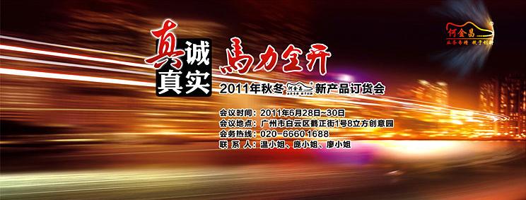 “何金昌”2011年秋冬訂貨會將于6月28日至30日,在廣州8立方創意園隆重舉行。此次訂貨會以“真誠·真實——開足馬力”為主題,訂貨會期間公司將對新形勢下,何金昌品牌的發展方向做出規劃和指導,屆時,來自全國的何金昌經銷商朋友將匯集廣州,為品牌的發展獻計獻策,并搶先領略2011何金昌秋冬新款的風采。